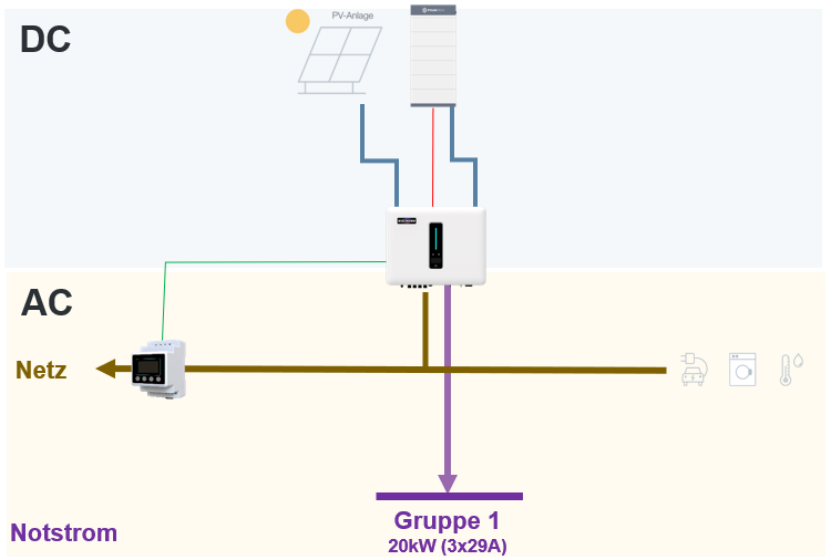 Das Design kombiniert einen Hybrid-Wechselrichter Solinteg MHT-20K-40 mit einem Hochvolt-Batteriespeicher Pylontech Force H3. Es ermöglicht die Nutzung von Solarenergie, Netzstrom und Notstromversorgung in einem integrierten System.