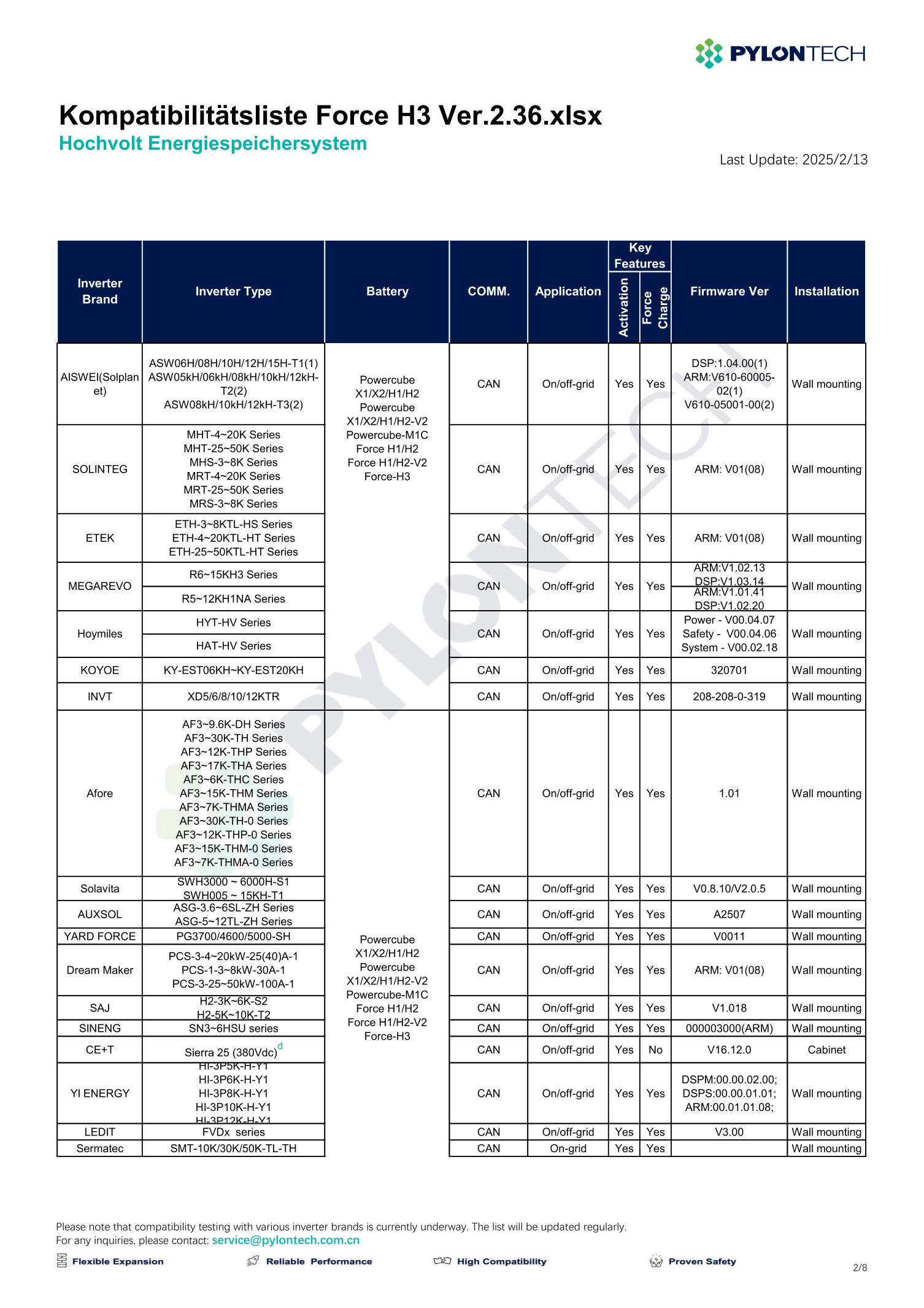 Kompatibilitätsliste Zu beachten:Um die volle Garantieleistung zu gewährleisten, muss die Anzahl der verwendeten Batteriemodule zwingend mit dieser Liste übereinstimmen.Die komplette Liste finden Sie unter:Force H3 - Pylontech-Website, Pylon Technologies Co.. Ltd.Kompatibel mit: Veröffentlicht 02.04.2026 11:42