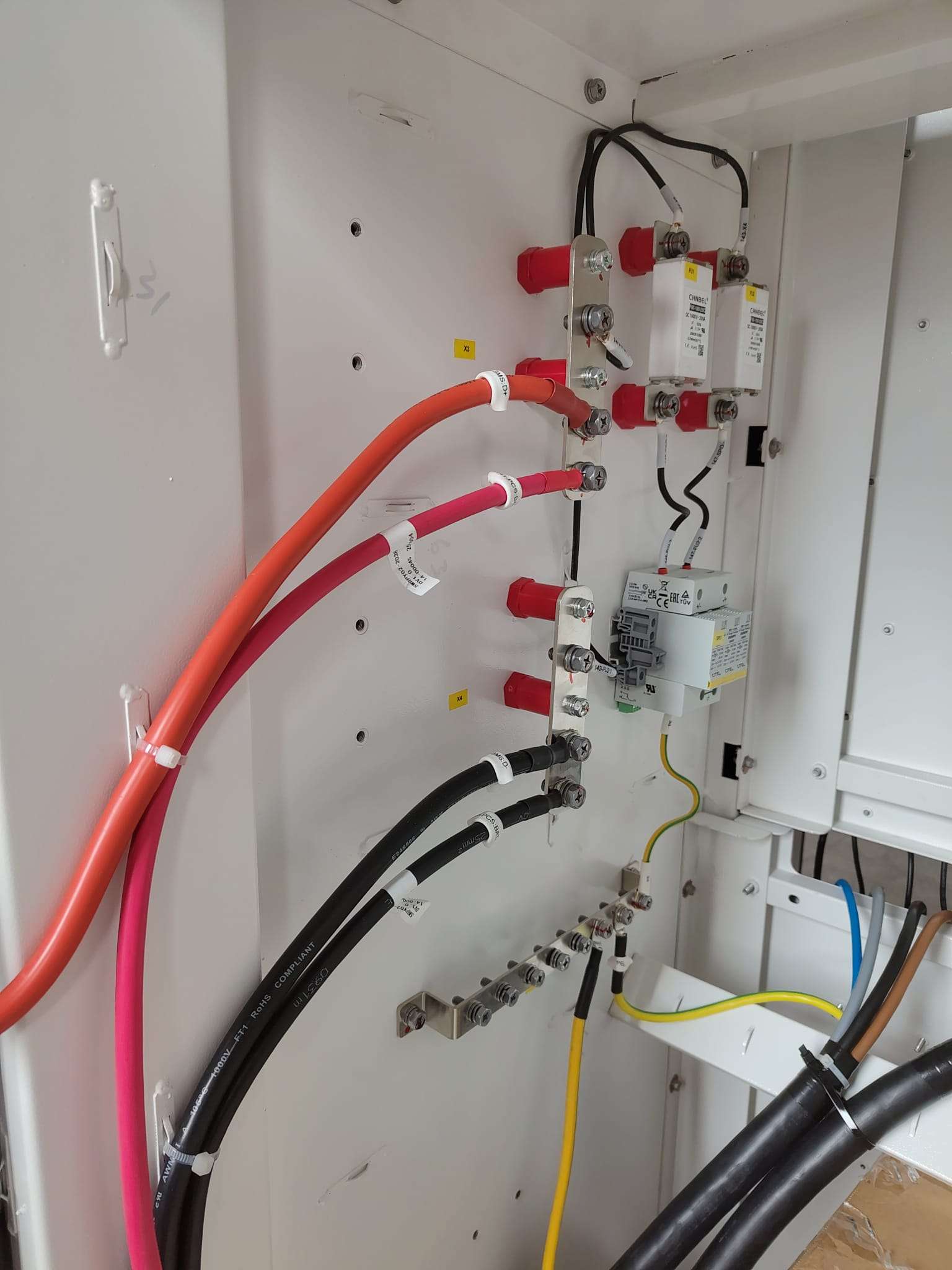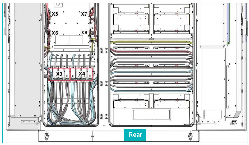 a. Verbinden Sie die Stromkabel von den [BAT]-Anschlüssen des Hybrid-Wechselrichters 1 mit der DC-Sammelschiene [X5-positiv] und [X6-negativ] im Schrank.
