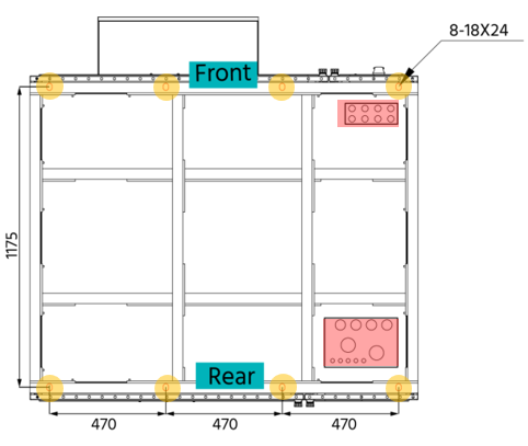 - Das Fundament für die Installation muss das Gesamtgewicht des gesamten Batterieschranksystems (ca. 2900 kg) tragen können.