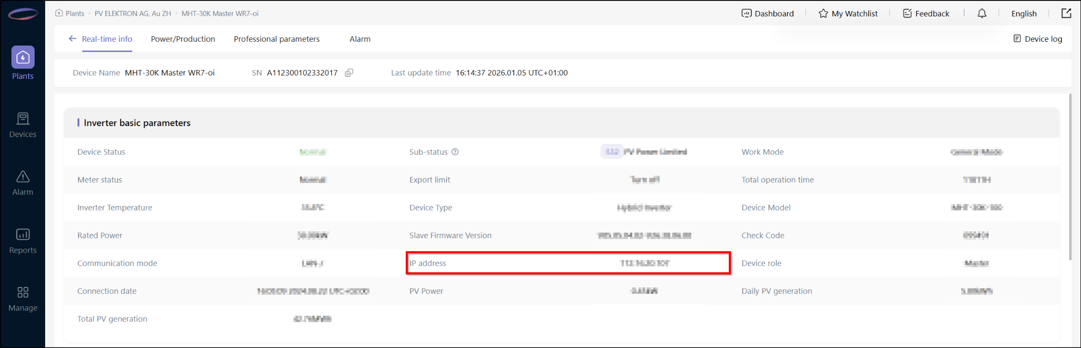 IP Adresse im Solinteg Webportal: